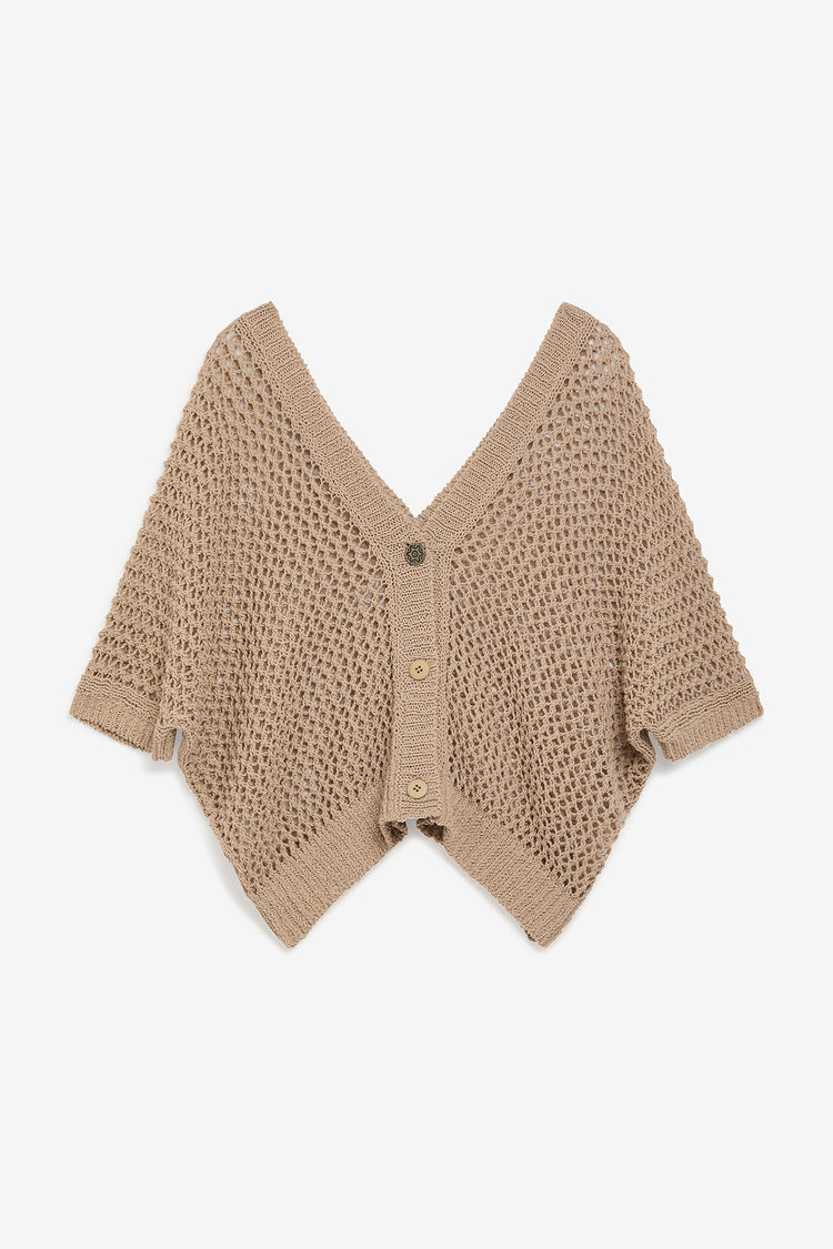 Cardigan corto V, vestibilità over, in cotone e lavorazione a rete. Apertura davanti e sulla schiena con primo bottone speciale.