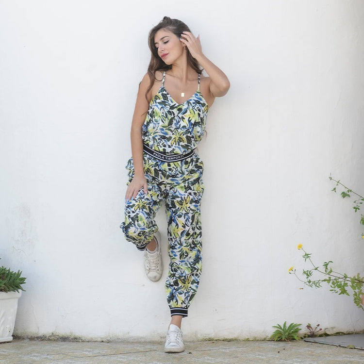 Pantalone fantasia floreale con elastico in vita, tasche laterali nascoste ed elastico alle caviglie.