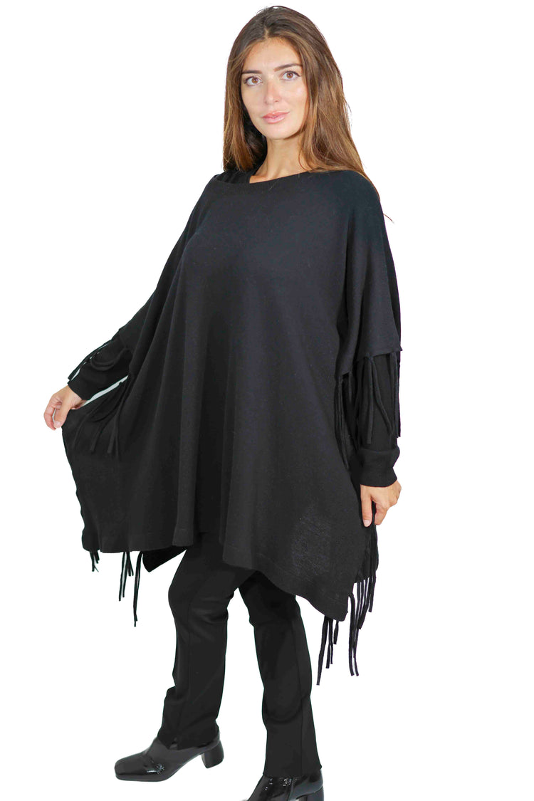 Poncho in cachemere lavorato a mano con dettagli  con scollo tondo e frange