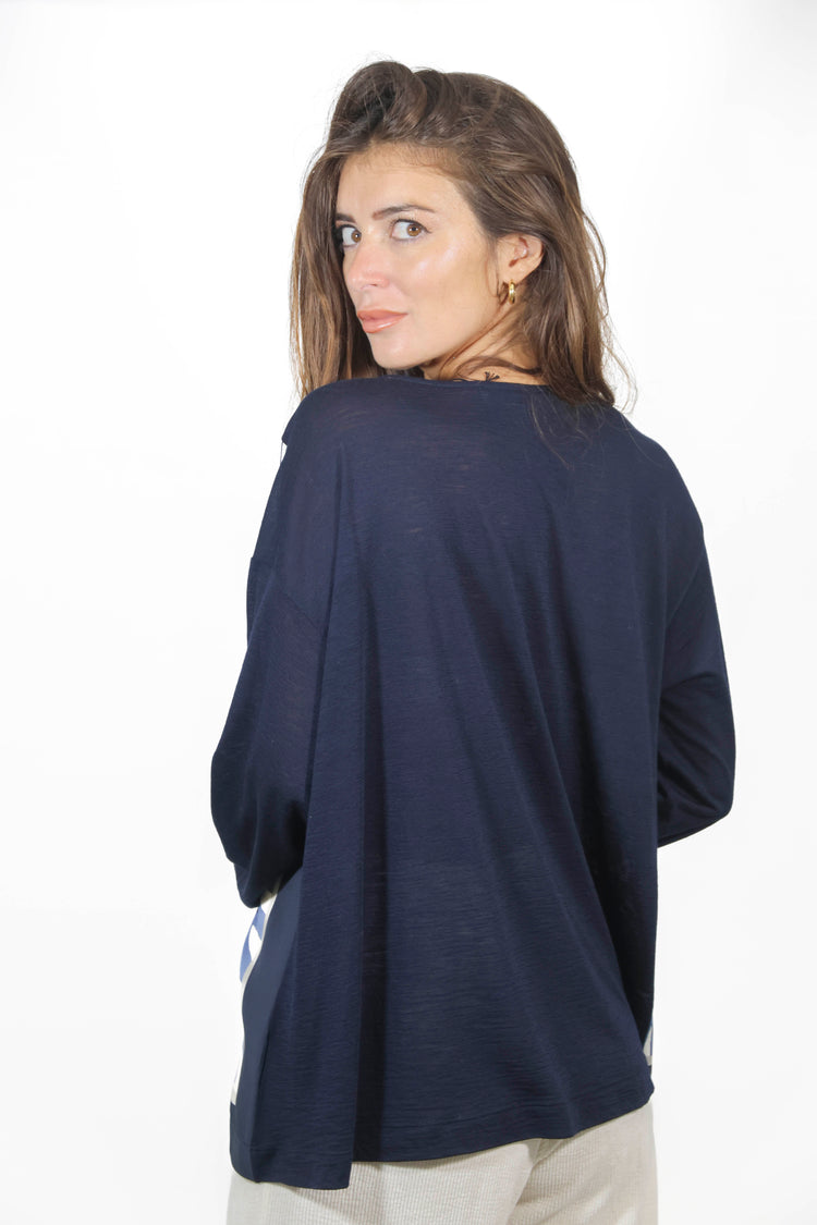 Maglia misto lana e seta, con maniche lunghe e collo tondo; decorazione frontale.