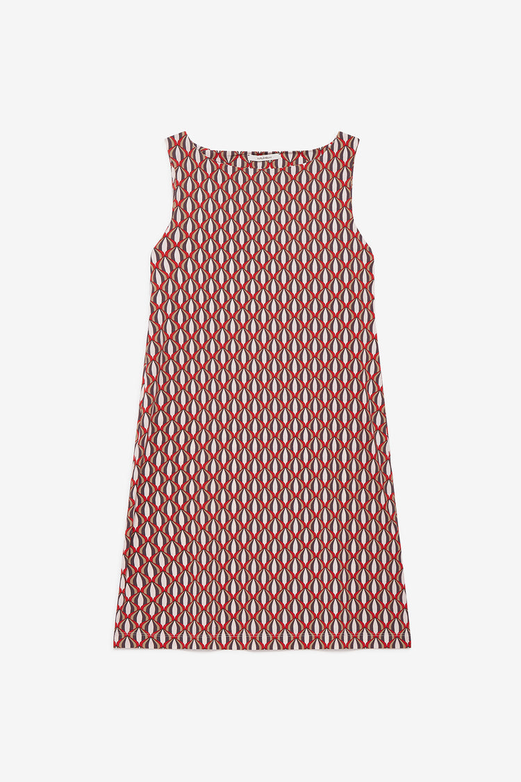 Abito in viscosa stretch stampato, scollo barchetta a giromanica.