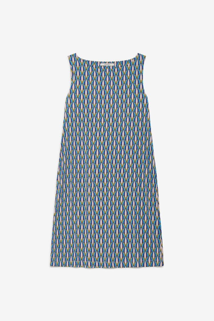 Abito in viscosa stretch stampato, scollo barchetta a giromanica.