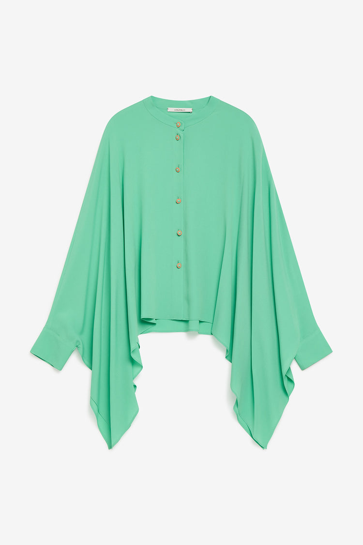 Camicia over in crepe de chine misto seta, collo alla coreana e manica lunga con polso. Bottoni speciali ricoperti in tessuto con doppio colore.