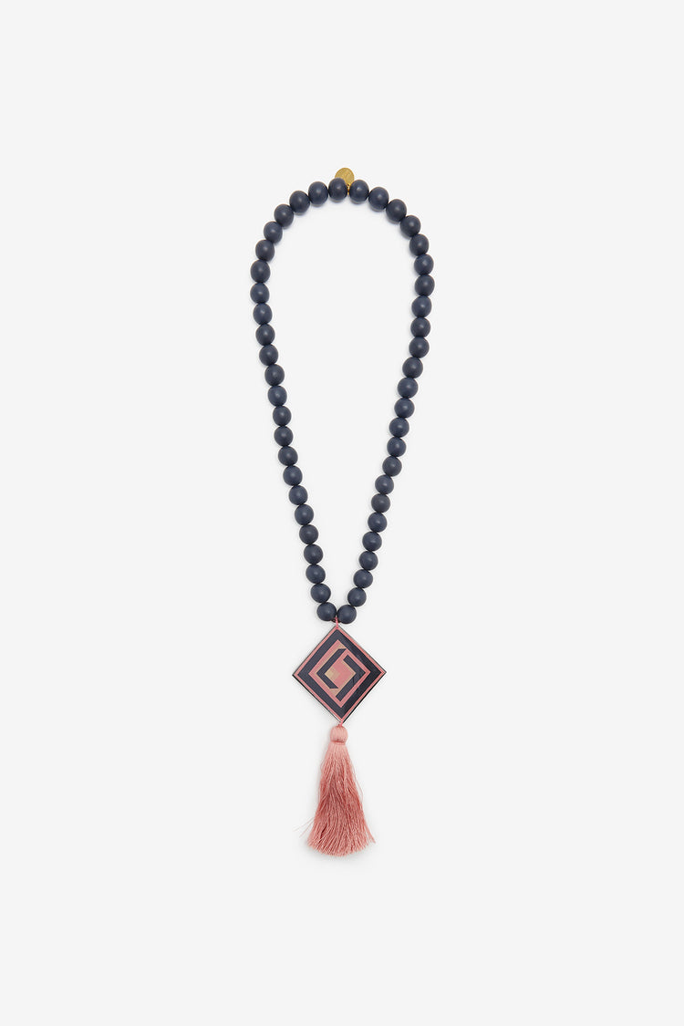 Collana in catena metallica ricamata di perlina su perlina con ♥ e tubolare in pelle. Pendente in resina con stampa di collezione e nappina in filo.