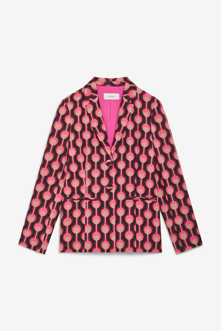 Giacca monopetto in cady tecnico stretch stampato con tasche a filetto e bottoni speciali ricoperti in tessuto.