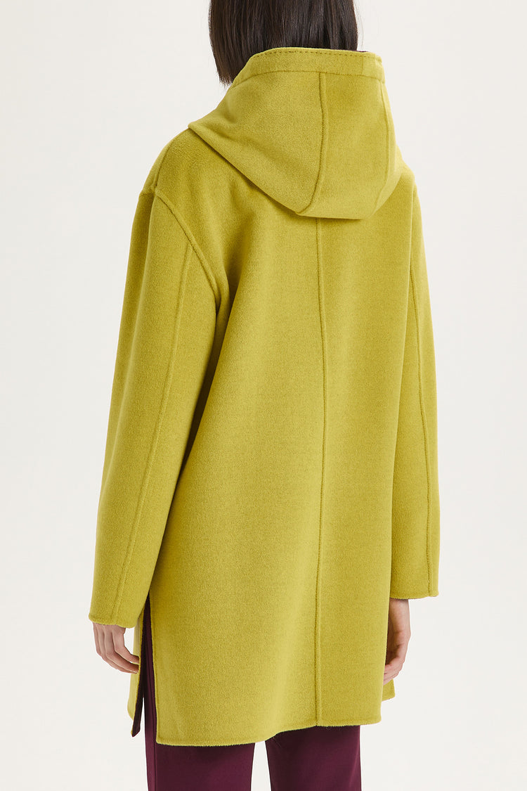 Giaccone reversibile con cappuccio, in lana bicolore, completamente cucito a mano e con chiusura a zip.