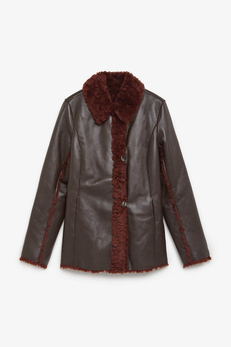 Giaccone reversibile monopetto dalla linea accostata in eco montone e nappa con mix di bottoni speciali. Tessuto riciclato.